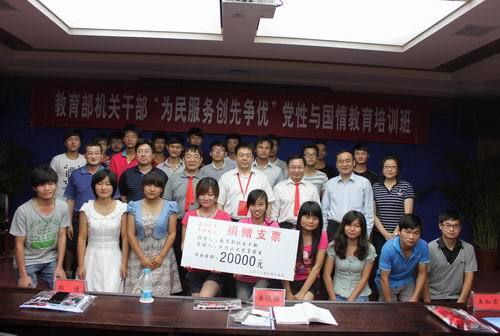 6月15日,教育部机关干部“为民服务创先争优”党性与国情教育专题培训班全体学员,带着对井冈学子的深情厚意,在我校举行帮困助学捐赠仪式。教育部机关党委组织宣传处处长郭宇光将20000元捐赠交给我校校长张泰城,副校长曾建平出席捐赠仪式,捐赠仪式由培训学院李忠院长主持。