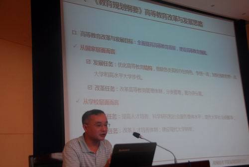 昌庆钟教授从《教育规划纲要》高等教育改革与发展思路、《教育规划纲要》的实施与进展、高等教育领域的改革试点项目、《教育规划纲要》实施背景下井冈山大学改革思考等四个方面进行了阐述。