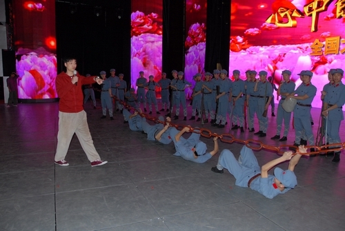 为充分表现红军在长征中不怕牺牲、前仆后继,勇往直前、坚韧不拔,众志成城、团结互助,百折不挠、克服困难的精神,编导在节目中安排了再现“飞夺泸定桥”的场景,这“爬铁索”的情景由王松鹤、裴琪、张峰三个同学表演。尽管这个场景的表演时间不到10秒,台下观众看着也许会认为很简单,但要表演好必须付出沉重的“代价”。根据剧情,表演时人要仰卧在地面,双脚用力蹬地同时背部以及双肩必须紧贴地面快节奏地往前蹭,表演时双手虽然拉住了铁索,可是“铁索”只是道具,承受不了多少实际的力量,只能靠背部和双肩用力。第一次排练下来,三个同学的背部尤其双肩就受伤了,薄薄的演出服上还渗出了血迹,老师和同学看着都心痛了,但三个同学硬是咬紧牙关,十几天来这个动作反复了上百遍,他们的皮肤一次又一次被擦破,同学就一遍又一遍在他们背、肩部位贴纱布和胶布。他们总共用去的纱布和胶布有上百卷。为了防止伤口化脓,他们每天不能正常洗澡,晚上睡觉也只能趴着卧在床上。即使这样,他们也没叫苦叫累,一直坚持演到了最后。