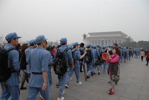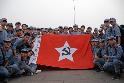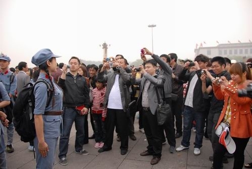 在天安门广场,身着红军服排着整齐的队伍的我校大学生,以青春朝气、落落大方而成为了众多游客关注的热点,他们纷纷拿起相机,拍下了这一道亮丽的风景。许多游客还热情询问了学校的情况,以及大学生来京的目的,并要求与大学生们合影。