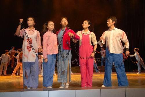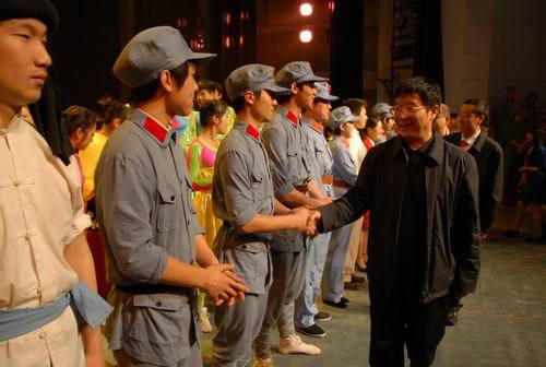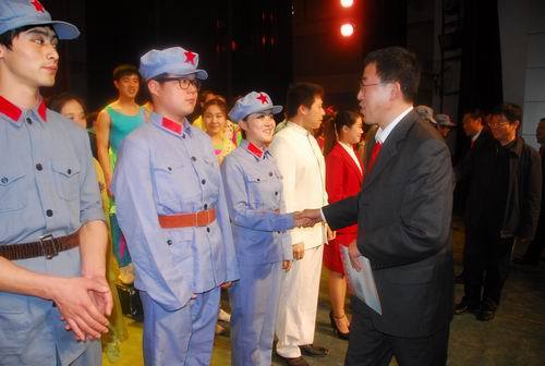演出结束后,张泰城、曾建平以及培训班学员走上舞台,接见参演大学生。培训班学员代表、乐山师范学院党委书记罗大玉发表了热情洋溢的讲话。他说,培训班全体学员怀着激动的心情看完了整场演出,精彩的演出不仅是艺术的展示,更展示了当代大学生特别是井冈山大学学子的风采。我们深切地感受到了井冈山精神在大学生中的传承和发展。我们希望井冈山大学学生在井冈山精神的哺育下更好地成长,我们也希望全国有更多的大学生发扬井冈山优良传统。