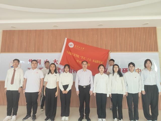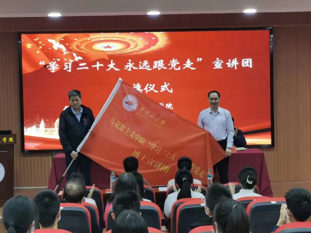 为扎实推进党的二十大精神和党中央精神的学习宣传,10月20日下午,马克思主义学院举行“学习二十大 永远跟党走”宣讲团授旗仪式,校党委副书记刘祖文应邀出席并授旗。学院全体班子成员、宣讲团成员、井研会和青研社成员与会。