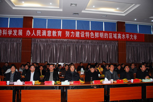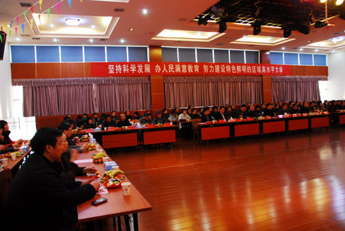 张泰城指出,2012年,学校将认真贯彻落实国家、省教育工作会议精神和《教育规划纲要》,按照学校十二五发展规划提出的目标和任务,不断推进教育改革,提高办学水平,提升办学层次,努力把我校建设成为特色鲜明的区域高水平大学。一要遵循大学发展规律,进一步强化学校内涵建设,二要加强国际交流与合作,着力提升学校教育的国际化水平,三要进一步完善办学条件,提升后勤保障水平,推进和谐校园建设。
