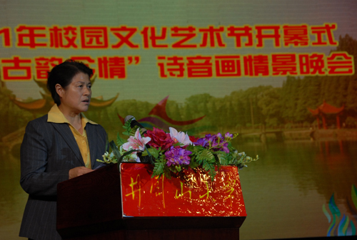 金桂英在致词中说,吉安自古人杰地灵,素有“江南望郡”的美称。文天祥、欧阳修、解缙等一大批历史文化名人先后在这块热土诞生成长,并形成了中国传统文化中的典型代表——庐陵文化。在中国当代历史上,吉安创造了新的光荣,老一辈无产阶级革命家在这里创建了第一个农村革命根据地,锻造了伟大的井冈山精神。我们以“传承庐陵文化,弘扬井冈精神”为主题,举办2011年校园文化艺术节,充分体现了座落在吉安这块红土地的井冈山大学,坚持用中国特色社会主义文化来引领团员青年、服务广大师生和推动学校发展。