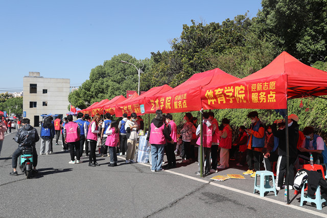 在校内迎新点,一顶顶印有“新生报到处”字样的帐篷整齐划一地铺排开来,帐篷下是一群群身着志愿马甲的志愿者。有教育学院的蓝;数理学院的绿;艺术学院的紫;化工学院的橙……五颜六色的花海成为了迎新现场的一道靓丽的风景线。在校门入口处,在各学院报到点,热情地志愿者们一一接过新生们的行李。来自21生科的江子旻同学在帮助新生搬运行李时说:“在我刚来学校的时候,学长学姐帮助了我很多,现在我作为新生的学长,也想通过实际行动让新生们体会到学校的温暖。”