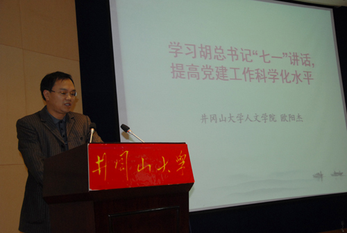 欧阳杰以《学习胡总书记“七一”讲话,提高党建工作科学化水平》为题,从“党建工作科学化”问题的提出,“党建工作科学化”的内涵以及对于“提高党建科学化水平”的思考等三个方面展开论述,他认为胡锦涛总书记在“七一”讲话中指出,我们要以改革创新精神研究和解决党的建设面临的重大理论和实际问题,全面推进党的建设新的伟大工程,不断提高党的建设科学化水平。这是对全党提出的更高要求。他结合学院党建工作,提出了不断优化学院党建工作科学化发展的实践载体,不断创新学院育人的实现途径,不断丰富党建工作科学化发展的理念等加强基层党建工作的举措。