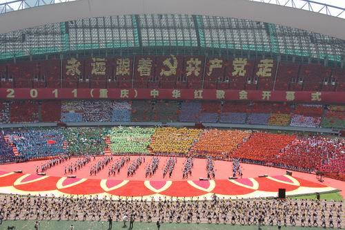 出席本次红歌会开幕式的领导及嘉宾有中共中央政治局委员、重庆市委书记薄熙来,重庆市市长黄奇帆以及前美国国务卿基辛格博士等。在两个多小时的演出时间里,第五代“江姐”扮演者王莉、著名歌唱家万山红、张明敏等人,也来到现场献唱,引起一阵阵观众高潮。虽然当天重庆的天气有些闷热,但是并不影响合唱队员们的演出热情。我校合唱团在当天的演出中分别演唱了《过雪山草地》,红歌联唱《春天的故事》、《走进新时代》、《江山》、《在灿烂的阳光下》等红色歌曲。本次中华红歌会开幕式取得了重大的成功。演出最后,全场演员和观众共同起立,在合唱《没有共产党就没有新中国》的歌声中,本次开幕式圆满落下帷幕。(艺术学院)