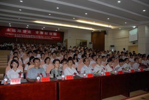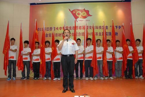 7月5日上午,由同济大学、井冈山大学、遵义师范学院、延安大学、中国人民大学联合举办的“杜鹃烂漫中国梦、青春辉映党旗红”全国大学生纪念建党90周年主题实践活动出征仪式在井冈山大学举行。团省委书记王少玄为主题实践团授旗并宣布出征。团省委副书记梅亦,吉安市委常委刘宗华,在校的校领导万继抗、金桂英、罗学渭、王伴青、肖长春、黄翔峰,党委委员吕玉华、龙学先,省学联驻会执行主席余冬青,团省委学校部部长李菲,团省委权益部部长许桂芳,团吉安市委书记曾亮等出席,肖长春致辞,校团委书记郭新春主持。中国人民大学、同济大学、延安大学、遵义师范学院,省内兄弟院校社会实践服务队的团委书记和师生代表以及我校“青年马克思主义者培养工程”——第三期“井冈之星”大学生骨干培训班学员、大中学生志愿者代表共300余人参加了会议。