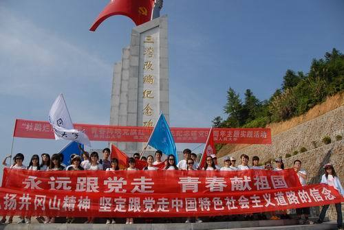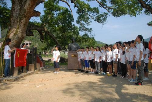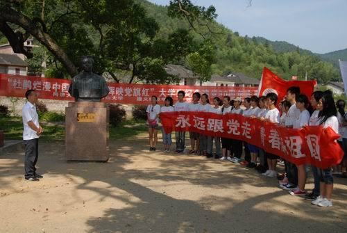7月6日上午,全体队员来到永新县三湾镇,参观了三湾纪念馆,并在枫树坪下面对党旗庄严的重温了入党誓词。全体队员还对2009年毕业于我校电信学院的吉安市十佳大学生村官,现为全国十大幸福村党支部书记的邢镭同学进行了现场访谈。