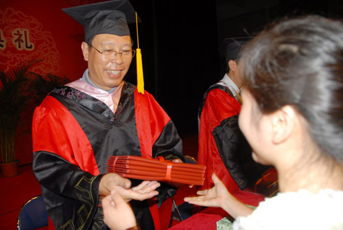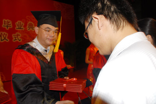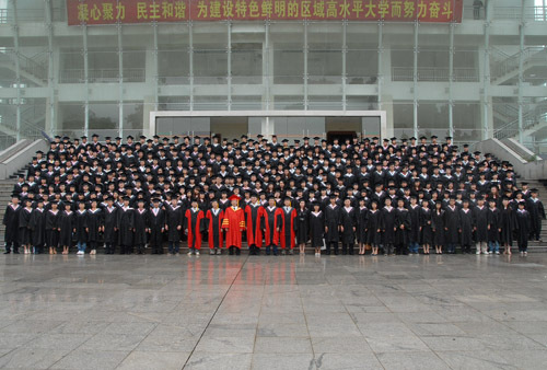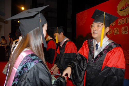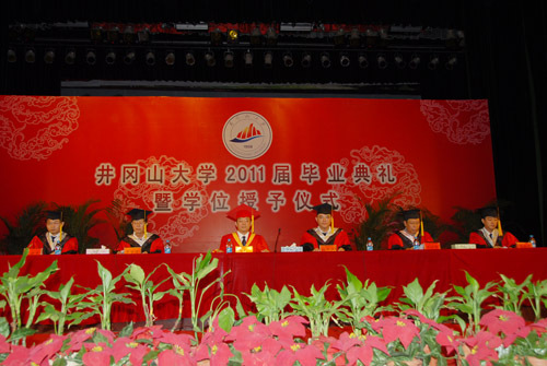 6月17日,我校隆重举行2011届毕业典礼暨学士学位授予仪式。校长张泰城致辞,副校长桂国庆宣布毕业生名单和学士学位获得者名单,副校长罗学渭主持。校领导曾建平、王伴青、黄翔峰出席毕业典礼,并为毕业生颁发毕业证和学位证。各学院党政负责人,有关部门负责人参加会议。生命科学学院教师黄族豪、艺术学院毕业生胡粤泉发言。