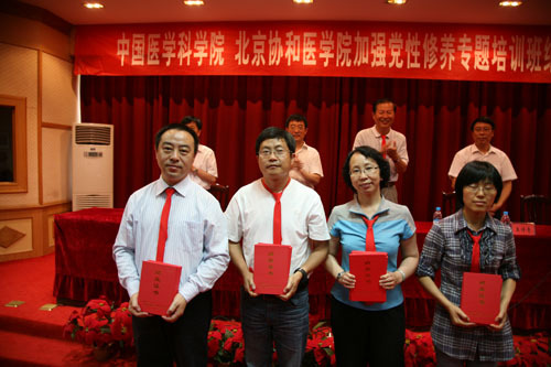5月21日上午,中国医学科学院、北京协和医学院2011年领导干部“加强党性修养、坚定理想信念、继承优良传统”第三期专题培训班结班式在我校举行。中国医学科学院、北京协和医学院院校副院校长徐德成,校长张泰城出席并为全体42名学员颁发结业证书,副校长罗学渭主持,副校长王伴青出席。学员代表马春雨发言。学员代表向我校赠送了锦旗。