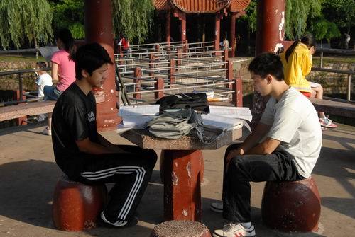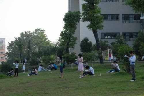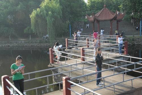 6时20分,校内各条主干道上是川流不息的学生,有的背起书包走进教室,开始早自习;有的捧着书本,在湖心亭、教学楼前以及其他场所,或三五成群,或坐或站,琅琅的读书声在校园内此起彼伏。运动场上,许多班级在组织同学做早操;学生会堂前,体育学院的武术兴趣小组在老师带领下练起了太极拳;数理楼群旁,爱美的女生在高年级学生带领下,跳起了动感十足的健美操;环校路上,各学院数千名师生自发地跑步健身,场面蔚为壮观;北区以及校内每个球场上,数不清的学生打起了篮球、排球、羽毛球、网球,他们以自己喜爱的方式健身锻炼,表现出青年学子应有的勃勃生机。