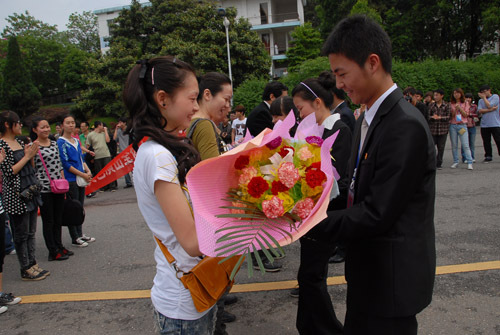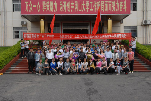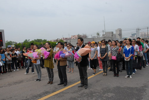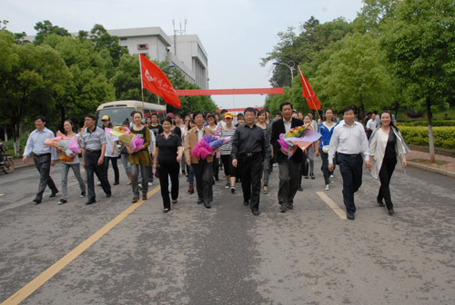 5月6日上午10时许,副校长罗学渭率领参加2011年全国大学生“五月的鲜花—永远跟党走”大型校园文艺会演的我校师生60余人,从北京胜利返回学校。学校举行隆重的仪式欢迎他们凯旋。校长张泰城,党委副书记金桂英、副校长王伴青,党委委员、办公室主任吕玉华,有关部门负责人以及数百名师生在校门口迎候,并为师生代表献花。张泰城发表了热情洋溢的讲话。
