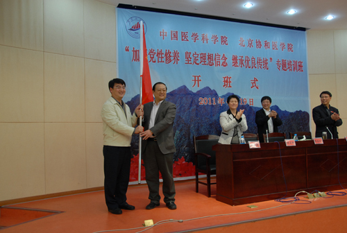 4月19日, 中国医学科学院、北京协和医学院2011年领导干部“加强党性修养、坚定理想信念、继承优良传统”专题培训班在我校举行开班仪式。中国医学科学院、北京协和医学院党委书记兼常务副院校长李立明出席开班式并讲话。校长张泰城出席,党委副书记金桂英致词,副校长王伴青主持。李立明为第一期培训班授旗。