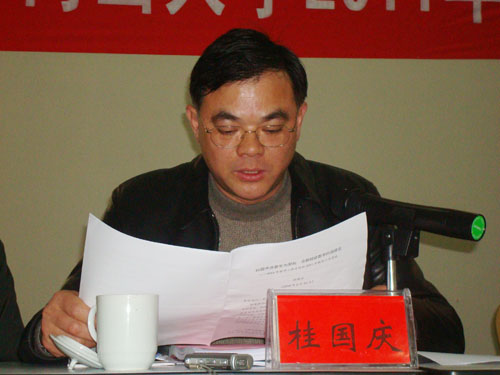 桂国庆从质量工程、专业建设、教学研究、日常教学运行等方面全面总结了2010年学校教学工作,指出了取得的成绩和存在的问题。同时,提出了2011年学校教学工作的基本思路,指出2011年学校教学工作在抓好常规教学管理的基础上,着重做好以下工作:以国家、省中长期教育改革与发展规划纲要为指导,制定并实施学校人才培养发展规划;以调动师生两个积极性为重点,提升教育教学质量;以承办教育部“五月的鲜花”文艺演出为契机,展示我校艺术教育和其它学科教育成果;继续做好对口支援工作,开展好同济大学联合培养本科生工作和“同济学术周”活动;围绕教育实习学期制,积极探索实践教学改革;创新人才培养模式改革,开展好双学位教育工作;进一步落实教学管理重心前移,加强教学学院工作监控;提高教学管理的技术含量,做好常规教学管理工作。