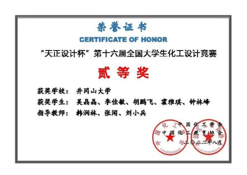 近日,2022年“天正设计杯”第十六届全国化工设计大赛圆满落幕,经过我校参赛队伍几个月的的奋战,井冈山大学化学化工学院的2支队伍脱颖而出,分别获得全国二等奖和华中赛区三等奖。