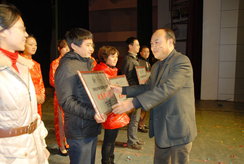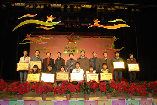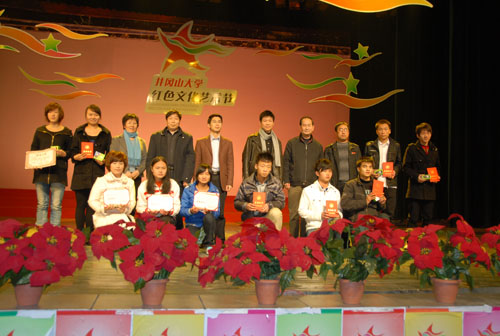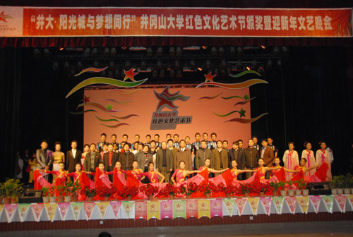 12月29日晚,“春之歌”红色文化艺术节颁奖暨迎新年文艺晚会隆重举行,标志着为期一个多月的2010年红色文化艺术节胜利闭幕。校党委书记万继抗出席并为获奖者颁奖,校党委副书记金桂英出席并代表学校发表了热情洋溢的讲话。在校的领导郭名根、罗学渭、王伴青、曾建平、黄翔峰,以及党委委员吕玉华、龙学先、肖长春出席,吉安移动公司总经理张丽华、团市委书记曾亮、吉安阳光房地产开发公司营销总监叶汉财等也应邀观看了晚会。校领导与嘉宾共同为2010年红色文化艺术节获奖集体和个人颁奖。