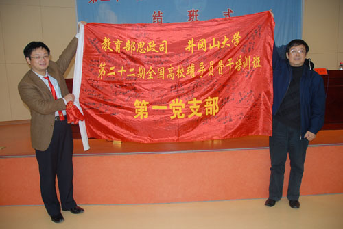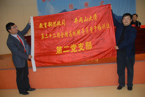 学员代表王宇波、田新民畅谈了学习感想和体会。他们说,5天以来,全体学员体会了紧张,收获了充实,丰富了阅历,学到了知识,陶冶了情操,升华了思想,拓展了思路。对井冈山精神有了深刻的认识,井冈山精神也是当代大学生思想政治工作的法宝,自己在今后的工作中要充分发扬井冈山精神。