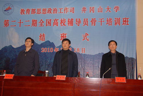 11月18日,由教育部思想政治工作司主办、井冈山大学承办的为期5天的第二十二期全国高校辅导员骨干培训班结班式在我校举行。副校长罗学渭主持,校长张泰城讲话,教育部思想政治工作司思想政治工作处处长徐艳国出席。张泰城、徐艳国为全体学员颁发了结业证书,学员代表王宇波、田新民代表培训班向学校赠送了“红色资源育人立德,井冈精神源远流长”的锦旗,并把全体学员签名的两面队旗赠送给我校收藏。来自教育部部属院校的80余名学员参加了结班式。