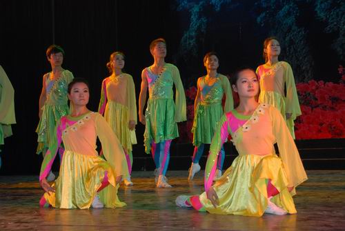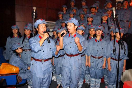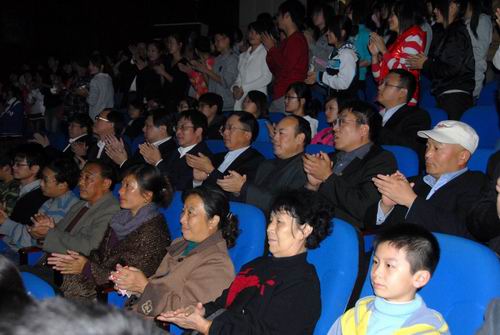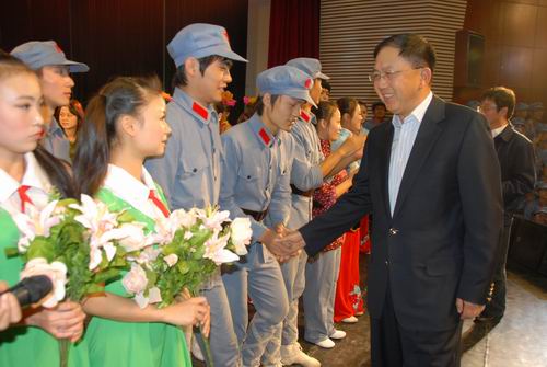 张志银一行在万继抗、张泰城等陪同下,走上舞台接见参演的大学生,祝贺演出成功,并与大家合影留念。