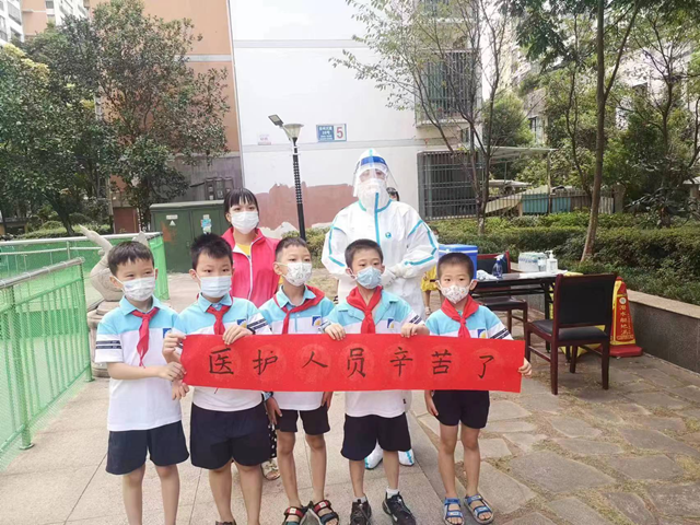 井冈山大学附属医院手术室护士张慧琳和消化内科护士刘卉茹是核酸采样队伍中的一对搭档。9月3日,在结束常规核酸采样工作后,发现石阳路小学的孩子们在一旁等候许久,带着水果、面包、牛奶等,准备向她们医护人员献礼,当小孩子们举起右手,目光炯炯地向她们行少先队礼的那一刻,“整个心都化了,特别感动,我们的工作很值得!”