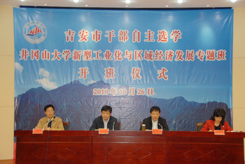 10月26日上午,吉安市干部自主选学井冈山大学新型工业化与区域经济发展专题班开班仪式在我校举行,吉安市委常委、组织部长刘义硚作动员讲话,校长张泰城致辞,副校长罗学渭主持,吉安市委组织部副部长徐开萍出席。吉安市参加自主选学的副科级以上干部40余人,以及我校培训授课的教师等参加了开班仪式。