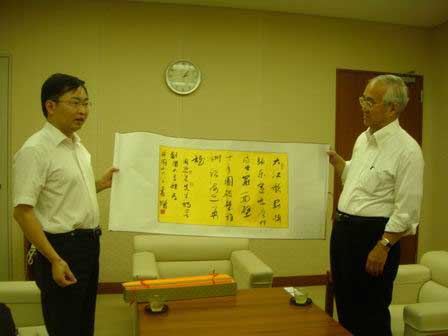 拜会山本校长时,曾建平代表学校向创价大学赠送了我校艺术学院教师创作的书法“大江歌罢掉头东”,盛情邀请山本校长到我校访问,山本校长愉快地接受邀请,并饶有兴致地问起了周恩来与井冈山革命时期的故事。