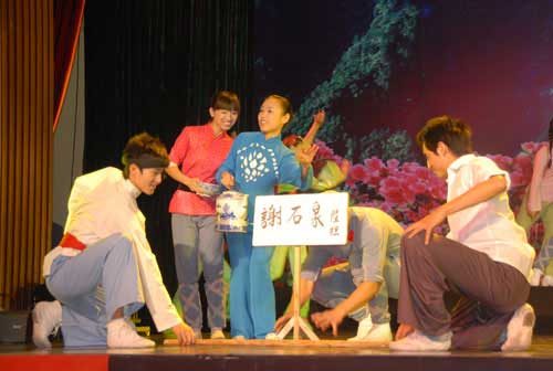 演出结束时,万钢、李学勇、曹健林、王伟中、郭向远、周家伦、张泰城等,走上舞台接见大学生,祝贺演出成功,并与大学生合影留念。