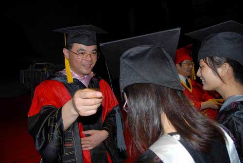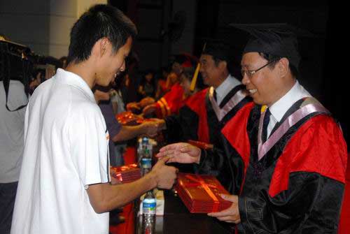 6月25日,我校隆重举行2010届毕业典礼暨学士学位授予仪式。校长张泰城致辞,副校长桂国庆宣布毕业生名单和学士学位获得者名单,副校长郭名根主持。校领导金桂英、罗学渭、王伴青出席毕业典礼,并为毕业生颁发毕业证和学位证。各学院党政负责人、分管学生工作的领导,以及有关部门负责人参加会议。人文学院教师张睫、政法学院毕业生李华堂发言。