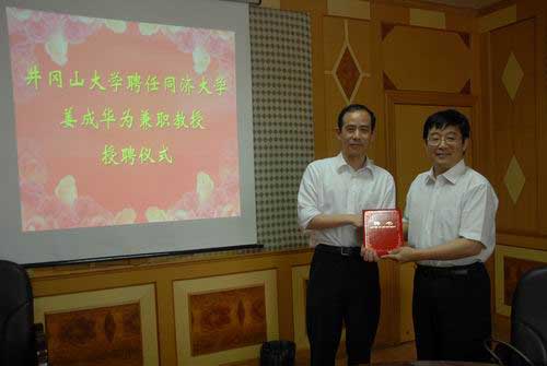 姜成华说,非常高兴被井冈山大学聘任为兼职教授,近些年来,井冈山大学在各方面都取得了很大的发展,今后自己更加有责任有义务加强与井冈山大学的交流与合作,促进双方的共同发展。