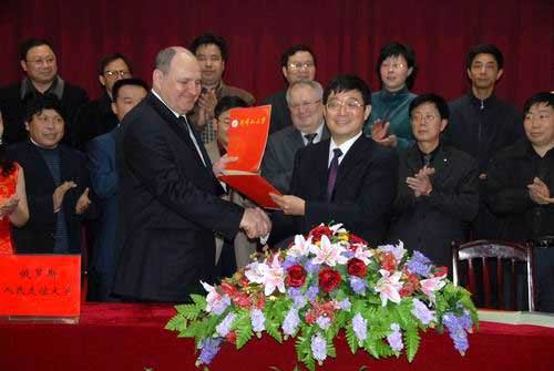 张泰城说,今天我们在这里隆重举行我校与俄罗斯人民友谊大学合作签字仪式,这是我校发展中的一件大事,对于促进我校又好又快发展将产生重要而深远的影响。张泰城指出,通过几天来双方的共同协商,两校在校际合作、教师交流、学生交流等方面达成了协议,为我校教师教学和学生交流提供了一个很好的平台。张泰城希望,两校以合作协议签署为契机,不断加强校际交流与合作,也希望俄罗斯人民友谊大学把先进的办学理念和先进的管理经验传授给我校,为我校造就一批学术造诣精湛的学科带头人和骨干教师、加强专业学科建设、提高学生素质、增强科研实力等给予大力支持和帮助。