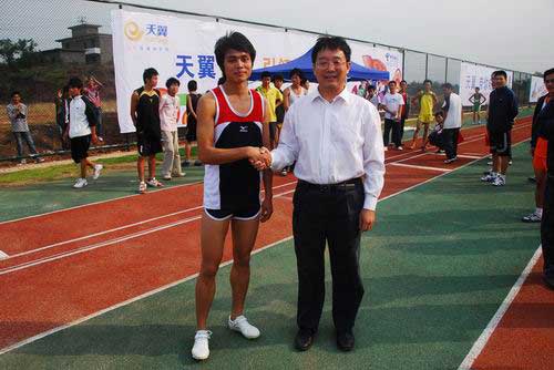 在男子甲组三级跳远现场,当看到信息科学与传媒学院07级彭豹同学以14.11米的成绩打破了从1995年保存至今的13.84米的学校最高记录,张泰城非常高兴,他握着彭豹的手说,你体现了新时期大学生的顽强拼搏精神。他勉励彭豹同学继续努力,争取更好成绩。