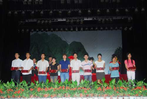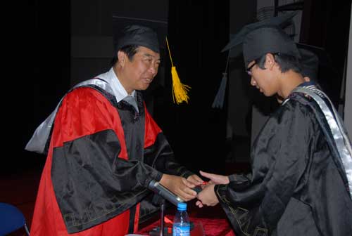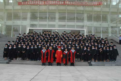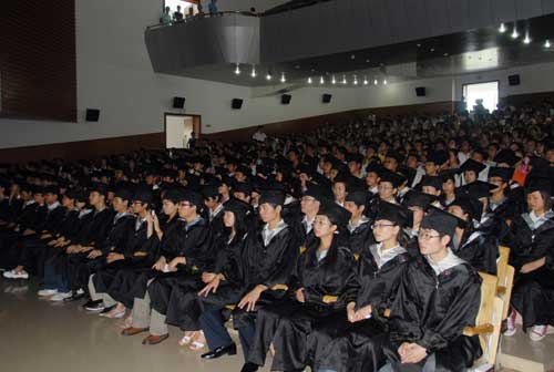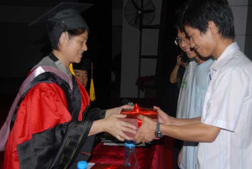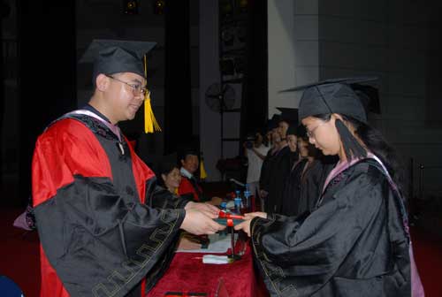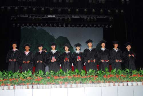 6月18日,我校1500名师生欢聚一堂,隆重举行2009届毕业典礼暨学士学位授予仪式。校长张泰城致辞,副校长桂国庆宣布毕业生名单和学士学位获得者名单,副校长郭名根主持毕业典礼,党委副书记、纪委书记金桂英,副校长王伴青出席毕业典礼。校领导为2009届毕业生颁发了毕业证书,为学士学位获得者颁发了学位证书。毕业生代表、化学化工学院应用化学05级本(1)班马远培,教师代表、全校2009年青年教师讲课比赛第一名、生命科学学院贺根和发言。