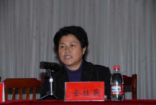 金桂英代表学校党政,感谢一年来在学生管理工作一线默默无闻、辛勤工作的全体工作人员。她指出,在过去的一年里,学校取得了不平凡的成绩,这其中凝聚着全体辅导员、学生管理工作人员的辛勤劳动。她希望奋战在学生管理工作一线的全体人员要牢记重任,加强服务育人的工作,要有历史的责任感和光荣的使命感。她希望全体学生管理工作人员要加强学习,进一步提升自身素质,用正确的思想去教育、引导和帮助学生。她希望学生管理工作人员要创新方法,不断提高服务育人的能力。