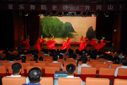 9月19日晚,由中国井冈山干部学院、同济大学和我校联合创编,我校大学生演出的音乐舞蹈史诗《井冈山》,在中国井冈山干部学院成功举行了第17场教学演出,得到了全体观众的充分肯定,取得圆满成功。中国井冈山干部学院副院长、井冈山大学校长张泰城,井冈山大学副校长罗学渭等领导到场观看。在学的第二期中央和国家机关司局级干部“中国特色社会主义理论体系”专题研究班,第四期中央和国家机关司局级干部“构建社会主义和谐社会”专题研究班,第54期专设班(第23、24期中央部委所属高校哲学社会科学教研骨干研修班赴井冈山学习阶段)等学员共200多人到场观看。