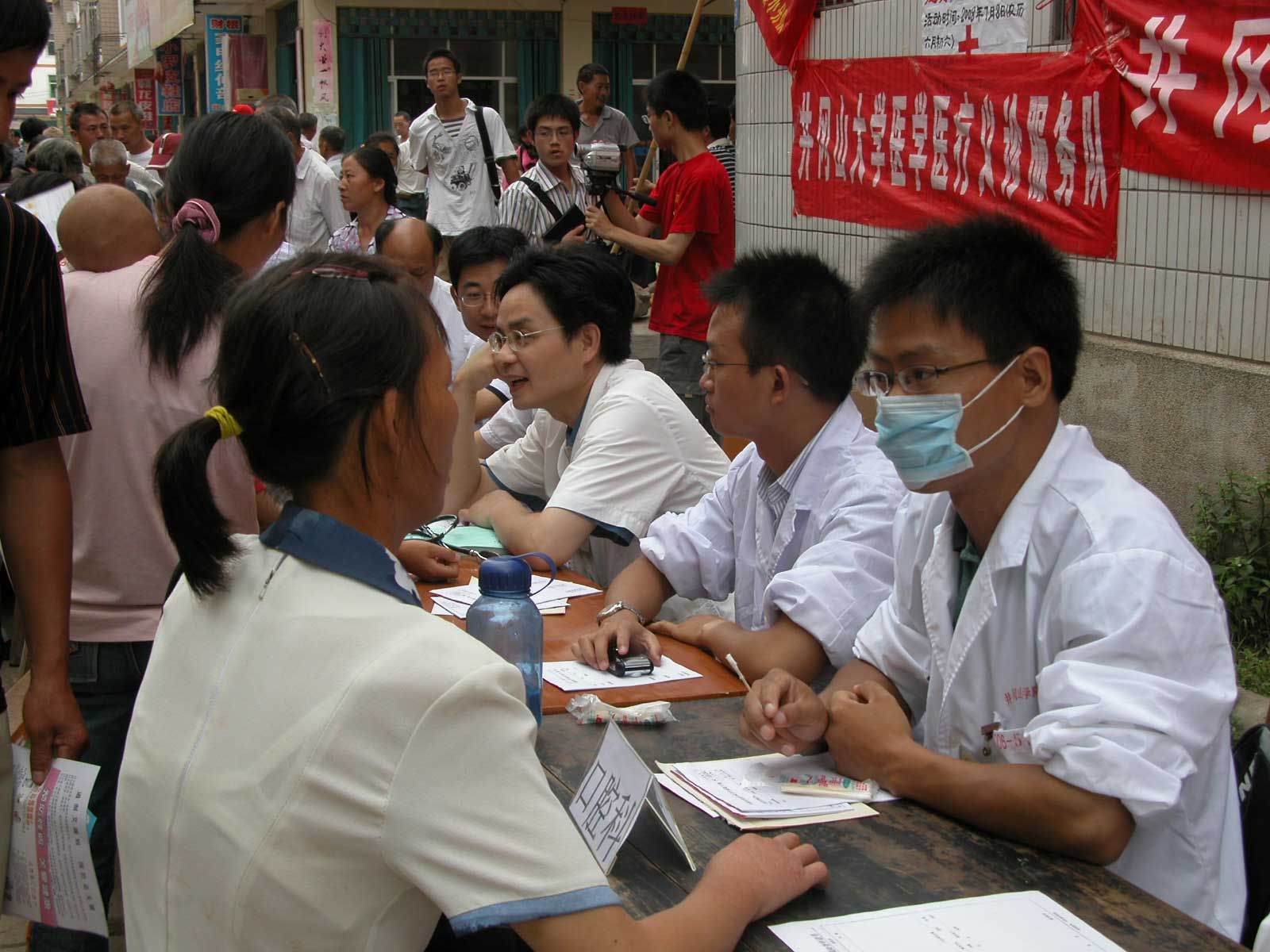 金桂英书记一行首先慰问了开展义诊的井冈山大学附属医院医疗专家和井冈山大学“‘医’路同行,奉献爱心”大学生社会实践团以及中国医科大学“爱药传播,红色之旅”医药卫生服务下乡大学生社会实践团的师生。当金书记看到医疗专家正耐心地为老百姓解疑答惑,一位位大学生志愿者在孜孜不倦地进行农村医疗状况调查时,高兴地勉励志愿者们努力工作,她说这次大学生社会实践能与中国药大的志愿者联手,以免费医疗咨询的形式为村民健康把脉,采取现场免费检测、医疗咨询、赠送药品等形式,把健康保健、疾病预防的相关知识送到百姓身边,是真真切切地做了一件大好事。她亲切地和老乡们聊天,在听到群众对医疗专家精湛的医术与大学生志愿者热情服务很满意后,金书记对送医下乡服务队的实践活动表示非常赞赏。这一天来,在值夏镇卫生院门口的医疗服务点上人头攒动,前来就诊和咨询的村民络绎不绝,乡镇的接到比平日里热闹了许多。有拄着拐棍的八旬老人,有抱在母亲怀里的婴儿,有来了解治疗困扰多年皮肤病的农民,也有来咨询腰腿痛的农用车司机。实践团的专家和大学生被围得里三层外三层,他们使出浑身解数,热情细致地为群众进行听心脏、量血压等项目的检查,不知疲倦地忙碌着。耐心入微的讲解,体贴而又温暖;图文并茂的宣传手册,内容丰富又实用;义诊活动接近尾声时,天淅淅沥沥地下起了雨,实践团专家仍撑着雨伞坚持为群众诊断病情,一项项耐心细致的坚持、一句句温馨的话语,让农民们心里感到热乎乎的。义诊当日,有数百名群众接受了诊疗,为百姓节约了数千元医疗费用。