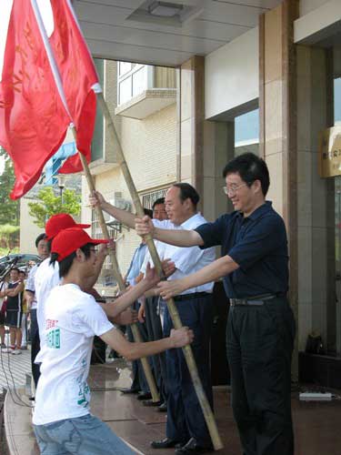 7月2日上午,我校2008年大学生志愿者暑期“三下乡”社会实践活动出征仪式在艺术大楼前举行。校党委书记万继抗,校长张泰城,党委副书记金桂英,副校长桂国庆、康泰、郭名根、罗学渭、王伴青出席仪式并为志愿者服务队授旗。校社会实践活动领导小组成员、各学院团委书记和学生代表共400多名师生参加了仪式。这标志着我校一年一度暑期社会实践的号角又吹响了。
