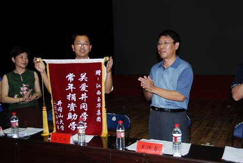 江小平代表江西玉华集团,向荣获玉华奖学金的各位同学表示热烈的祝贺。他希望同学们能够珍惜这次获奖的荣誉和机会,更加刻苦地学习科学文化知识,为将来施展个人抱负奠定一个坚实的基础。他说,玉华集团每年捐助8万余元,在井冈山大学设立扶贫助学奖学金,帮助那些经济困难的莘莘学子度过难关,顺利完成学业。他说,玉华集团也诚挚欢迎我校有志于玉华事业的学子的加入,用朝气蓬勃的风采使玉华永远年轻,用才华和汗水使玉华永远艳丽。