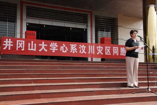 捐款仪式上,党委副书记金桂英代表学校作动员讲话。她说,5月12日下午,四川省汶川县发生了7.8级强烈地震,学校积极响应党中央的号召,大力弘扬“一方有难,八方支援”的精神,开展了募捐活动,为灾区人民献上一份爱心,送上一份温暖,贡献自己的一份力量。她号召全校师生积极行动起来,尽自己所能向灾区人民献上自己一份爱心。她还要求全校师生立足岗位,努力工作,勤奋学习,以实际行动来支持灾区抢救生命、重建家园。