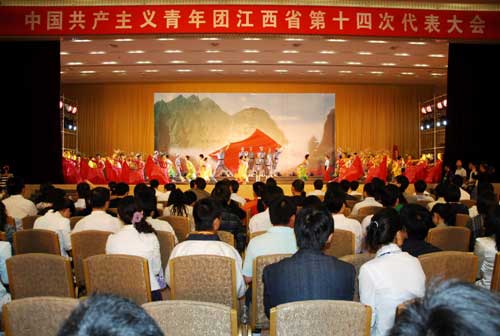 5月10日晚,由中国井冈山干部学院、同济大学和我校联合创编,我校音乐系学生近百人演出的音乐舞蹈史诗《井冈山》,应邀在南昌滨江宾馆大礼堂为正在召开的共青团江西省第十四次代表大会举行献礼演出,获得圆满成功。团中央组织部部长万超歧,团省委党组书记、团省委副书记王少玄,团省委党组成员、团省委副书记郭美荐,团省委副书记肖洪波,团省委党组成员、团省委副书记梅亦,团省委党组成员李建军、曾萍,团省委助理巡视员宋寅安,我校副校长罗学渭等,与出席本次团代会的、来自全省各地各条战线的500多名代表一起,兴致勃勃地观看了演出。