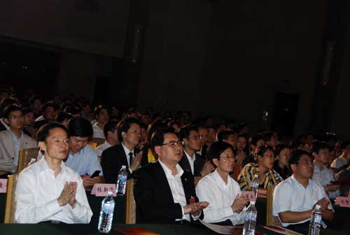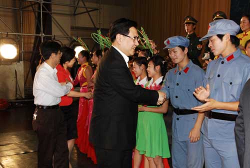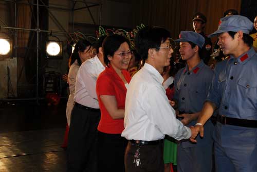演出结束后,王少玄等团省委领导和副校长罗学渭一起,走上舞台亲切接见全体演员,祝贺演出成功。