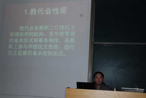 4月10日,党委书记万继抗为教代会代表培训班作了第一期报告。两场报告将进一步调动教职工参政议政的积极性,使即将召开的校一届三次教代会取得圆满成功。