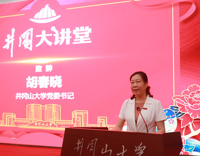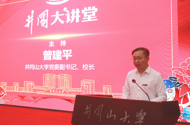 胡春晓指出,设立“井冈大讲堂”是学校党委深入贯彻习近平总书记关于办好思想政治理论课重要指示精神和落实《关于深化新时代学校思想政治理论课改革创新的若干意见》要求的重要举措,旨在创新思想政治教育形式,搭建汇聚校内外优质资源的思政教学平台。“井冈大讲堂”围绕学校思政育人特色,以赓续红色血脉、传承中华优秀传统文化、践行生态文明思想为核心,通过引进知名专家精品报告、打造校内特色精品报告、共享网络优质精品报告,构建具有“红、绿、古”特色的“井冈大讲堂”内容体系。