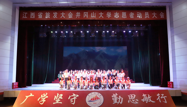 为做好2022年江西省旅游产业发展大会志愿服务工作,提升青年志愿者工作服务水平,5月19日晚,江西省旅发大会井冈山大学志愿者动员暨培训大会在学生会堂举行,吉安市委常委、统战部部长伍复康到现场看望志愿者,吉安市委副秘书长洪海波、共青团吉安市委书记彭少峥陪同,校党委书记胡春晓、党委副书记刘祖文出席动员大会,校党委常委、副校长刘利民在会上作动员讲话、党委常委、副校长冷明介绍志愿者教学、考试安排,校团委全体成员、全体志愿者负责老师、青年志愿者480余人参与此次大会。