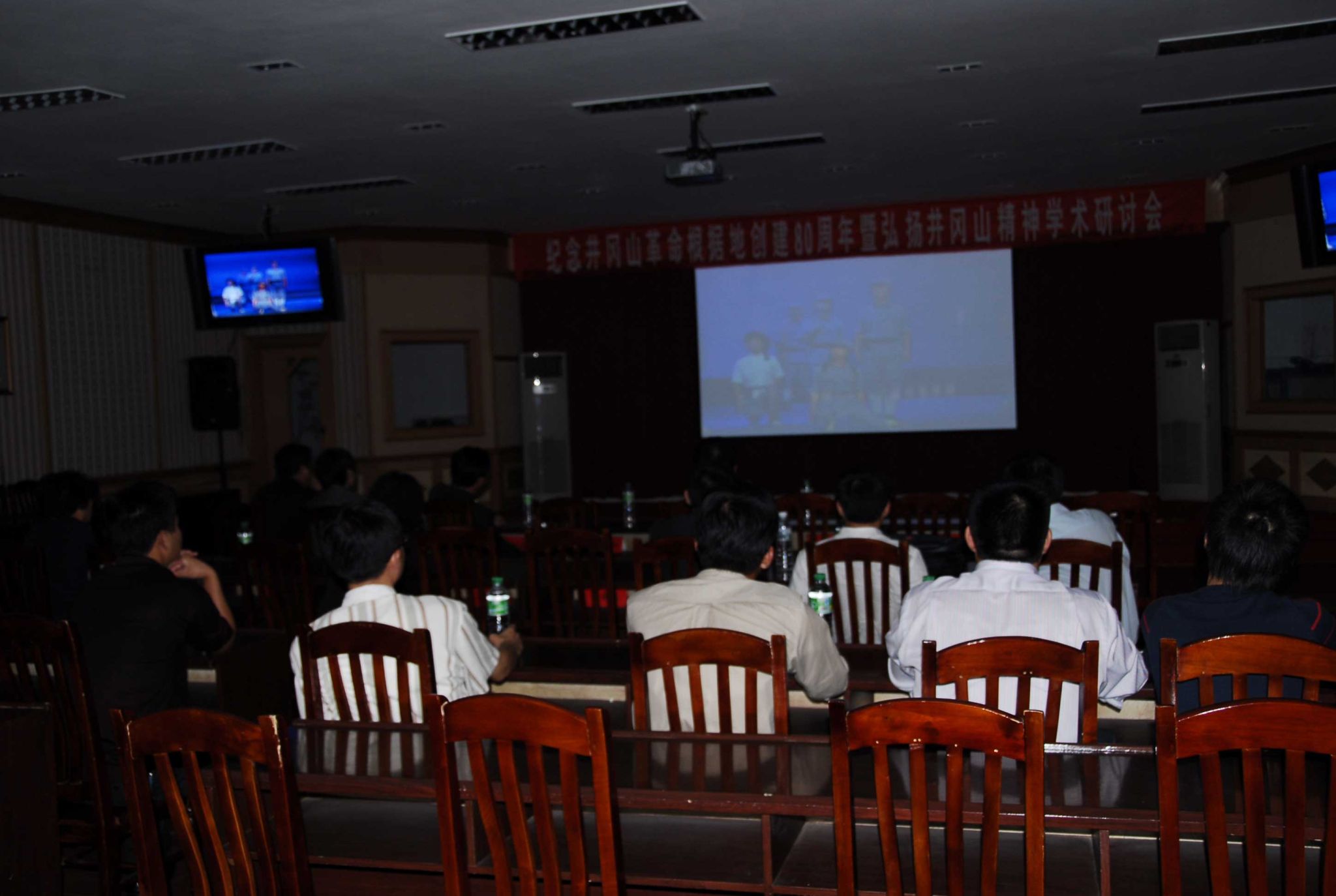 10月13日晚,前来我校参加全国井冈山精神学术研讨会的专家学者,兴致勃勃地观看了音乐舞蹈史诗《井冈山》录相片。校长张泰城、副校长罗学渭等陪同。