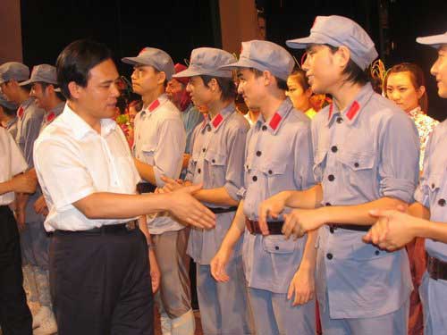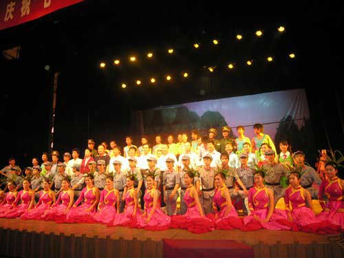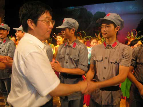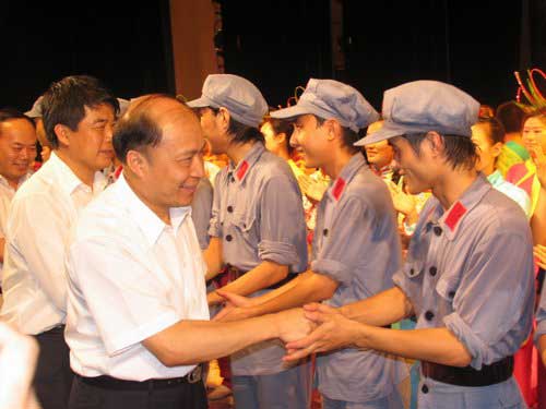 6月28日晚,为庆祝中国共产党建党86周年,音乐舞蹈史诗《井冈山》在吉安市展演,取得圆满成功。市委书记黄建盛,市委副书记、市长周萌,在家的市党政军领导蒋斌、吴敏、李文彩、杨群宝、张复平、李云、张和平、罗文季、黄武雄、韩晓方、孙世群、康泰、王伴青、符红涛、沈锦荣、肖斌、吴林诠、徐庆华,以及中国井冈山干部学院副院长张泰城、周金堂,学校领导万继抗、张泰城、孙甦、金桂英、桂国庆、郭名根、罗学渭等,和各界人士1000多人到场观看。演出结束时,市领导黄建盛、周萌以及校领导万继抗、张泰城等走上舞台,接见全体演员,祝贺演出成功,并与演员合影留念。