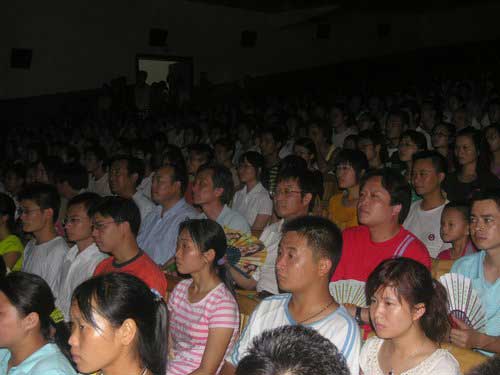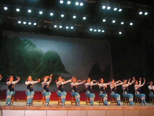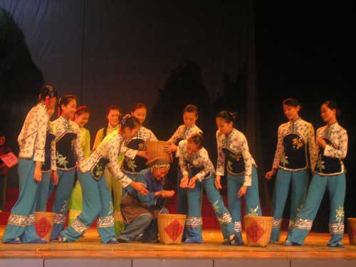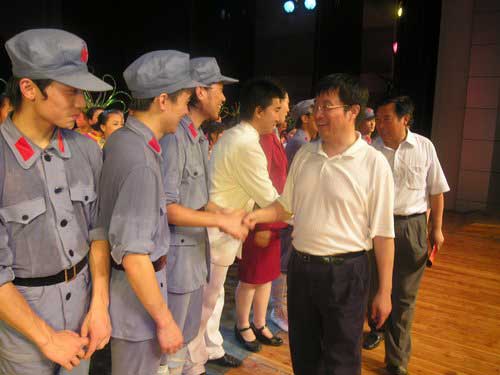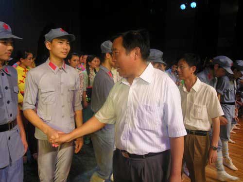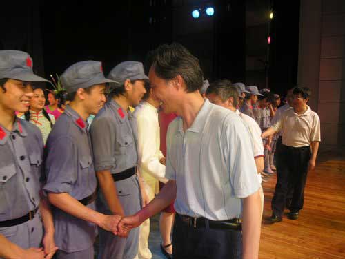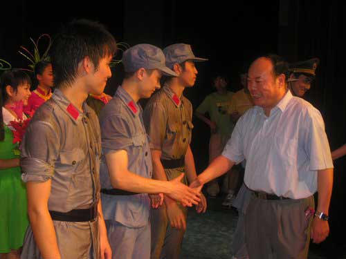 演出结束后,校领导及嘉宾走上舞台接见全体演员,祝贺演出成功,并与全体演员合影留念。