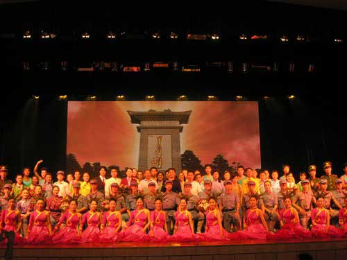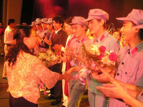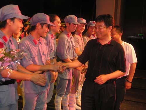 演出结束时,各位领导走上舞台,接见了全体演员,感谢大家带来了精彩的节目,让全体观众受到了一次生动、深刻的革命传统教育。各位领导还与演员合影留念。上海井冈商会向演员献花,对演出成功表示祝贺。