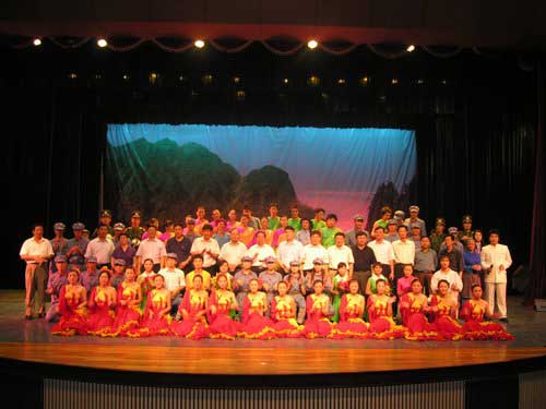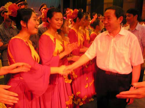 演出结束后,袁贵仁、漆权、杨群宝以及其他领导走上舞台,与演员亲切握手,祝贺演出成功,并与全体演员合影留念。