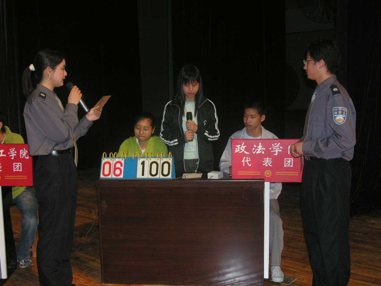 本次知识竞赛内容广泛,涵盖了《刑法》、《居民身份证法》、《消防法》、《道路交通安全法》、《治安管理处罚法》等法律法规和《大学生安全知识读本》,也很贴近大学生的实际。竞赛活动分两个阶段进行。第一阶段为初赛阶段,在4月18日至20日由各学院自行组织开展学院竞赛活动,选拔产生由3名学生(男女混合组队)的学院代表队,参加第二阶段的竞赛。第二阶段为复赛、决赛阶段,各学院按抽签分为两个小组进行两场复赛,小组前三名进入决赛,在经过4月25日、26日两场预决赛的基础上,4月28日晚举行决赛,决赛共有六个代表队参加,采取必答题、抢答抢时题、风险题等形式进行。经过激烈的角逐,政法学院代表队以高出第二名20分的成绩勇夺第一,第二名至第六名分别是工学院代表队、护理学院代表队、外国语学院代表队、化学化工学院代表队、商学院代表队,教育学院、生命科学学院获得优秀组织奖。